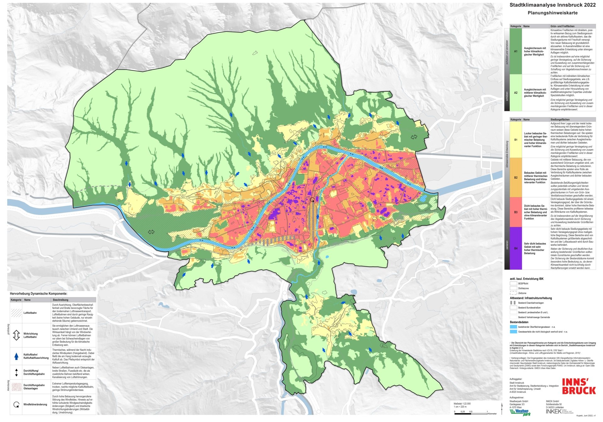 Die Planungshinweiskarte wurde in sechs Kategorien unterteilt: zwei Kategorien sind Ausgleichsräume, die aufgrund der Kaltluft schützenswerte Gebiete darstellen. Vier Kategorien betreffen teilweise oder komplett bebaute Siedlungsflächen, die mit mehr oder weniger thermischer Belastung ausgewiesen sind. Für alle Kategorien gibt es konkrete Empfehlungen mit einem Mix aus Maßnahmenvorschlägen. - Szenarienkarten: Für eine klimabewusste, zukunftsfähige Stadtentwicklung ist es nicht nur notwendig, auf die Ist-Situation zu reagieren, sondern auch die zu erwartenden Veränderungen zu berücksichtigen. Dafür wurden für Innsbruck Szenarienkarten erstellt, die Auswirkungen zukünftiger Stadtentwicklung sowie des prognostizierten Klimawandels bis 2100 plakativ darstellen: