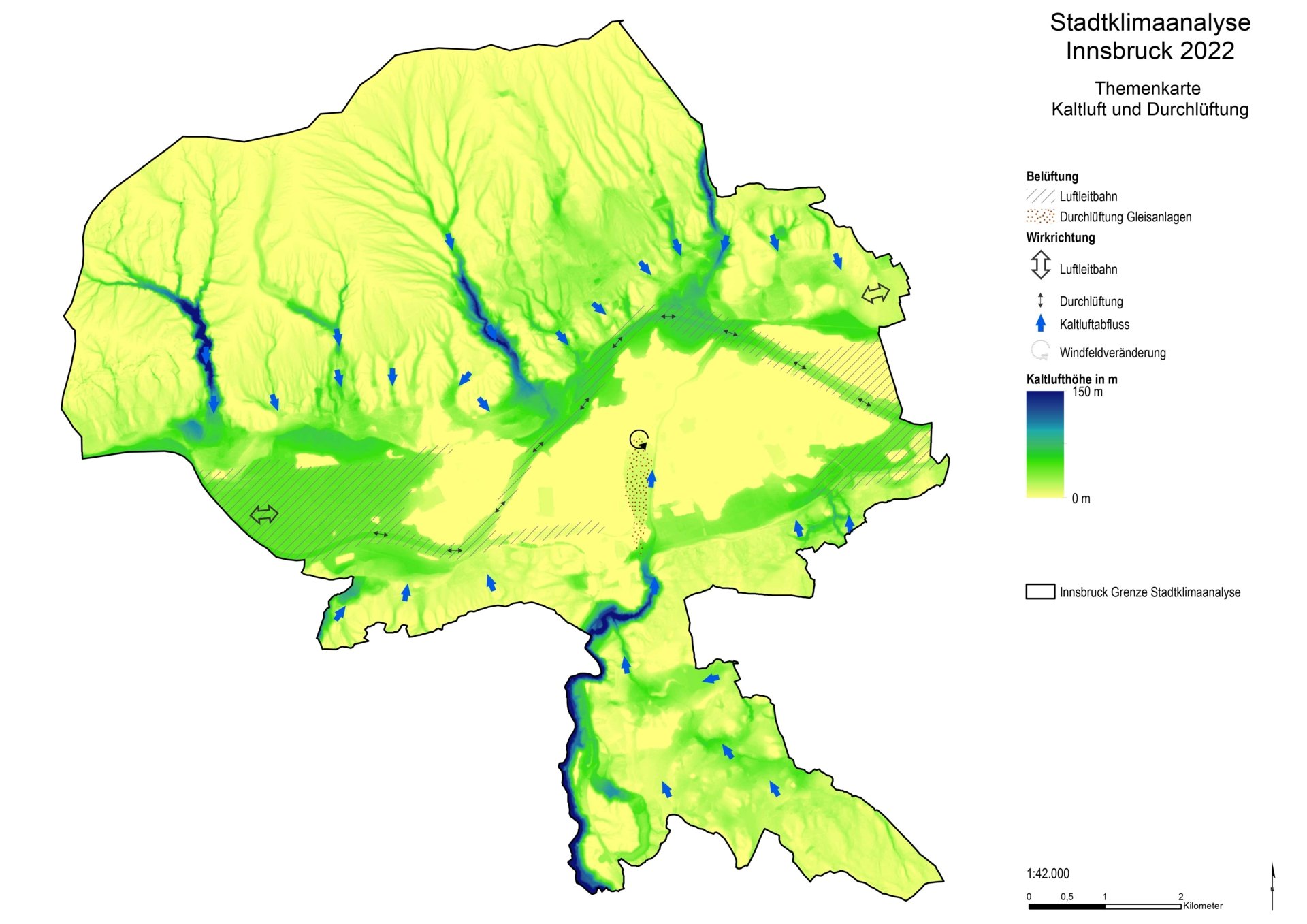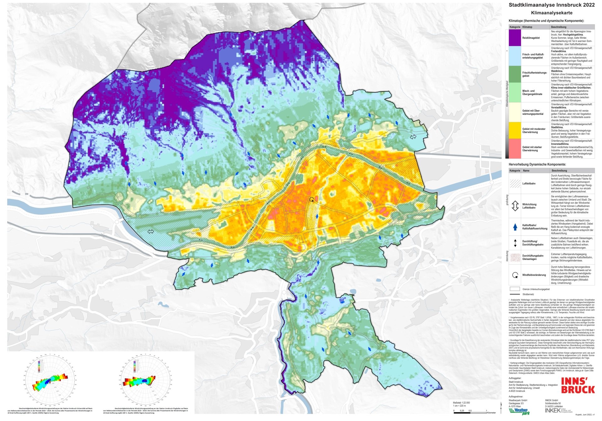 - Die Klimaanalysekarte enthält eine Zusammenschau der im Stadtgebiet relevanten Klimaphänomene und deren räumliche Verteilung. Um der extremen Topographie Innsbrucks gerecht zu werden, wurde das Klimatop „Reizklima“ entwickelt. Dieses Hochgebirgsklima ist charakterisiert durch kurze Sommer sowie lange und kalte Winter. Die Bedeutung liegt in der Wechselwirkung mit den Tallagen über die Kaltluftleitbahnen in warmen Sommernächten. Eine besondere Struktur stellt auch die Sillschlucht und der Sillverlauf durch die Stadt dar; sie bilden einen Frischluftkorridor, der weit in die Stadt reicht. Dies sind nur einige Besonderheiten der nun vorliegenden Klimaanalysekarte.
